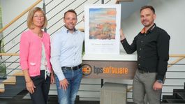 Was 1997 als kleines Start-Up in einem Laggenbecker Keller begann, ist heute ein erfolgreiches Software-Unternehmen mit einem über 1.000 m² großen Firmensitz im Ibbenbürener Gewerbegebiet Süd-Ost. Geschäftsführer Carsten Brockmann und Vertriebsleiter Oliver Brockmann begrüßen am 31.08.2022 IHK-Regionalbeauftragte Dorothe Hünting-Boll zur offiziellen Übergabe der Jubiläumsurkunde. Gemeinsam erinnern sie sich an die Anfänge von bps software, während sie Frau Hünting-Boll den frischen Anbau des Firmensitzes zeigen.
