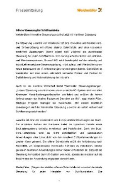 Auch für die maritime Wirtschaft bietet Weidmüller Steuerungslösungen. „Unsere Steuerung u-control sowie unser u-remote-I/O-System sind von allen führenden Klassifikationsgesellschaften zertifiziert und erfüllen die hohen Anforderungen der Marine Equipment Directive der EU“, sagt Martin Flöer, Strategic Program Manager bei Weidmüller. „Mit diesen maritimen Zulassungen darf die Weidmüller Steuerung u-control ab sofort weltweit auf Schiffen eingesetzt werden.“