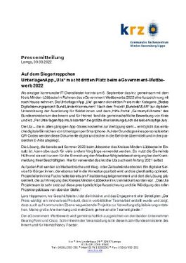 Lemgo, 09.09.2022 (PresseBox) - Als einziger kommunaler IT-Dienstleister konnte am 6. September das krz gemeinsam mit dem Kreis Minden-Lübbecke im Rahmen des eGovernment-Wettbewerbs 2022 eine Auszeichnung mit nach Hause nehmen. Die UnterlagenApp „Ula“ gewann den dritten Preis in der Kategorie „Bestes Digitalisierungsprojekt Bund/Länder/Kommunen“. Nach dem Projekt „BundesWEAR“ zur digitalen Unterstützung der Ausrüstung für Soldat:innen und dem „Hilfe-Portal „Germany4Ukraine“ des Bundesministerium des Innern und für Heimat fand die gemeinschaftliche Bewerbung von Kreis und krz „Per UnterlagenApp ins Jobcenter“ die größte Anerkennung durch die siebenköpfige Jury.