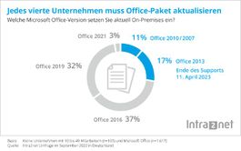 Tübingen, 26.09.2022 (PresseBox) - Jedes vierte Unternehmen in Deutschland setzt Microsoft Office-Pakete ein, für die bereits heute oder in wenigen Monaten keine Sicherheits-Updates mehr angeboten werden. Dies ist eines der zentralen Ergebnisse der diesjährigen KMU-Studie von Intra2net (www.intra2net.com). Der Groupware- und Security-Anbieter hat dafür die Daten von mehr als 1.600 PC-Arbeitsplätzen in kleinen Unternehmen ausgewertet.