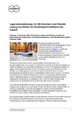 Die Zusammenarbeit zwischen Körber und DB Schenker reicht bis ins Jahr 2006 zurück und hat zahlreiche erfolgreiche Projekte in den Bereichen Lagerverwaltungssoftware, Automatisierung, Voice und Simulation hervorgebracht. Mit der in Rekordzeit erfolgten Implementierung und der voraussichtlichen Inbetriebnahme Anfang 2023 festigt Körber seine Rolle als weltweit bevorzugter Lieferant von DB Schenker für AMR-bezogene Systeme. Die Roboter werden es Schenker ermöglichen, flexibel zu skalieren, schrittweise zu investieren und gleichzeitig die betriebliche Effizienz und Leistung zu steigern – voraussichtlich auf das Doppelte bis 2034.
