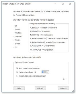Der Anwender wird bei der Konvertierung seiner Daten in GAEB-Online 2021 von einem Import-Assistenten unterstützt. Dieser ermöglicht es, die Daten aus Excel® mit verschiedenen Optionen in drei Schritten einzulesen. Die Wandlung in das GAEB-Format GAEB X80 findet anschließend automatisch statt. In GAEB-Online 2021 kann die so erzeugte Datei dann in jedes andere GAEB-Format konvertiert werden.