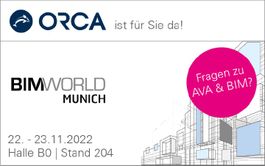 Neubeuern, 04.11.2022 (PresseBox) - Das Team der ORCA Software freut sich, auf der Münchner BIM World am 22. und 23. November Neuigkeiten rund um ihre Produkte ORCA AVA und AUSSCHREIBEN.DE zu präsentieren. Den Stand der ORCA Software finden Sie in Halle B0, Nr. 204.