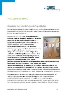 Kaarst / Unken, 10.01.2023 (PresseBox) - Die Sturm Funktionstüren GmbH aus Unken im Salzburger Land wird ihre Prozesse in Zukunft mit der Multiprojektmanagement-Software ams.erp INTERIOR steuern. Das Unternehmen, das als Tischlerei gegründet wurde und auf eine bald einhundertjährige Geschichte zurückblicken kann, entwickelte sich in den vergangenen Jahrzehnten zu einem Innovationsführer für bauliche Funktions- und Multifunktionselemente im deutschsprachigen Raum. Architekten und Tischler greifen auf Produkte von Sturm zurück, wenn individuelle Lösungen für anspruchsvolle Einbausituationen in höchster handwerklicher Qualität gefragt sind. Die maßgefertigten Türen, Fenster, Festverglasungen und Wandsysteme bieten je nach Anforderung zuverlässigen Schutz vor Feuer, Rauch, Einbruch, Schusswaffen, Lärm, Strahlen oder starken Temperaturschwankungen. Die Auswahl eines integrierten, branchenorientierten ERP-Systems mit exaktem Zuschnitt auf die Einzel-, Auftrags und Variantenfertigung war vor diesem Hintergrund folgerichtig. Das übergeordnete Ziel der Unternehmensleitung besteht darin, die Sicherheit in den Abläufen zu erhöhen und bisherige Fehlerquellen zu minimieren.