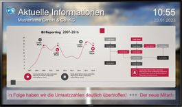 Hier kommt „Digital Signage“ ins Spiel: Informationen jeglicher Art werden dabei auf digitalen Bildschirmen bereitgestellt. Als Ersatz für das schwarze Brett im Pausenraum oder das Shopfloor-Board in der Fabrik kann ein Bildschirm als digitales, schwarzes Brett helfen, Informationen schneller, gezielter und ansprechender für Mitarbeiter bereitzustellen. Sogar Echtzeitdaten, etwa Kennzahlen aus dem Produktionsplanungssystem oder Reports aus Backendsystemen lassen sich einbinden.