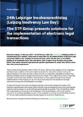 Karlsruhe /Leipzig, 13.02.2023 (PresseBox) - On 20 February, 2023, the STP Group, a leading provider of complete legal-tech solutions, will present its approaches for the implementation of electronic legal......