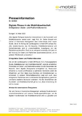 Stuttgart, 16.03.2023 (PresseBox) - „Der digitale Reifegrad deutscher Unternehmen in der Automobil- und Mobilitätsbranche variiert stark“, sagt Prof. Dr. Stefan Bratzel vom Center of Automotive Management über Erkenntnisse einer neuen Studie, die er im Auftrag der Landesagentur e-mobil BW verfasst hat. „Die Zulieferindustrie, das Kfz-Gewerbe, Mobilitätsdienstleister und Verkehrsbetriebe sind in unterschiedlicher Ausprägung von der Digitalisierung betroffen. Doch ist es zwingend notwendig, sich jetzt mit der Nutzung von Daten und Plattformen auseinanderzusetzen, um im globalen Wettbewerb zu bestehen.“